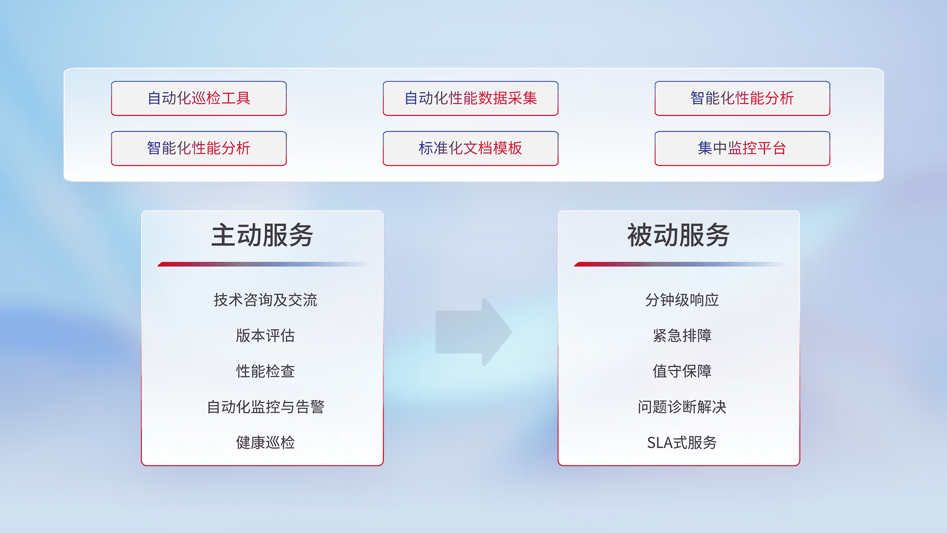 智能化工具和标准化文档,,,,保障服务质量,,,,提供主动服务(包含技术咨询、、、版本评估、、性能检查、、自动化监控与告警、、、、健康巡检)和被动服务包含(分钟级响应、、紧急排障、、、值守保障、、、、问题诊断解决、、、、SLA服务)。。。。