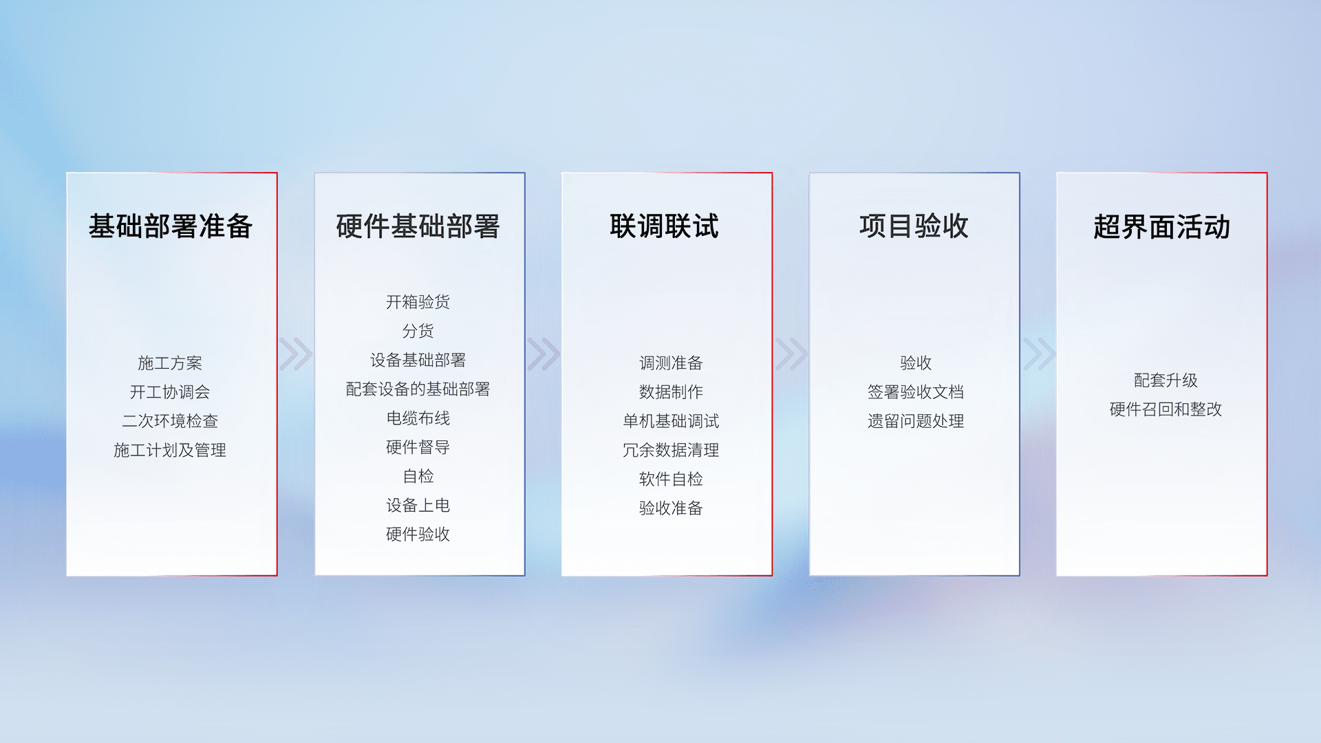 从基础部署准备、、、、硬件基础部署、、、、联调联试、、、、项目验收、、、、越界面活动的全过程可追溯,,,,保证施工质量和进度。。